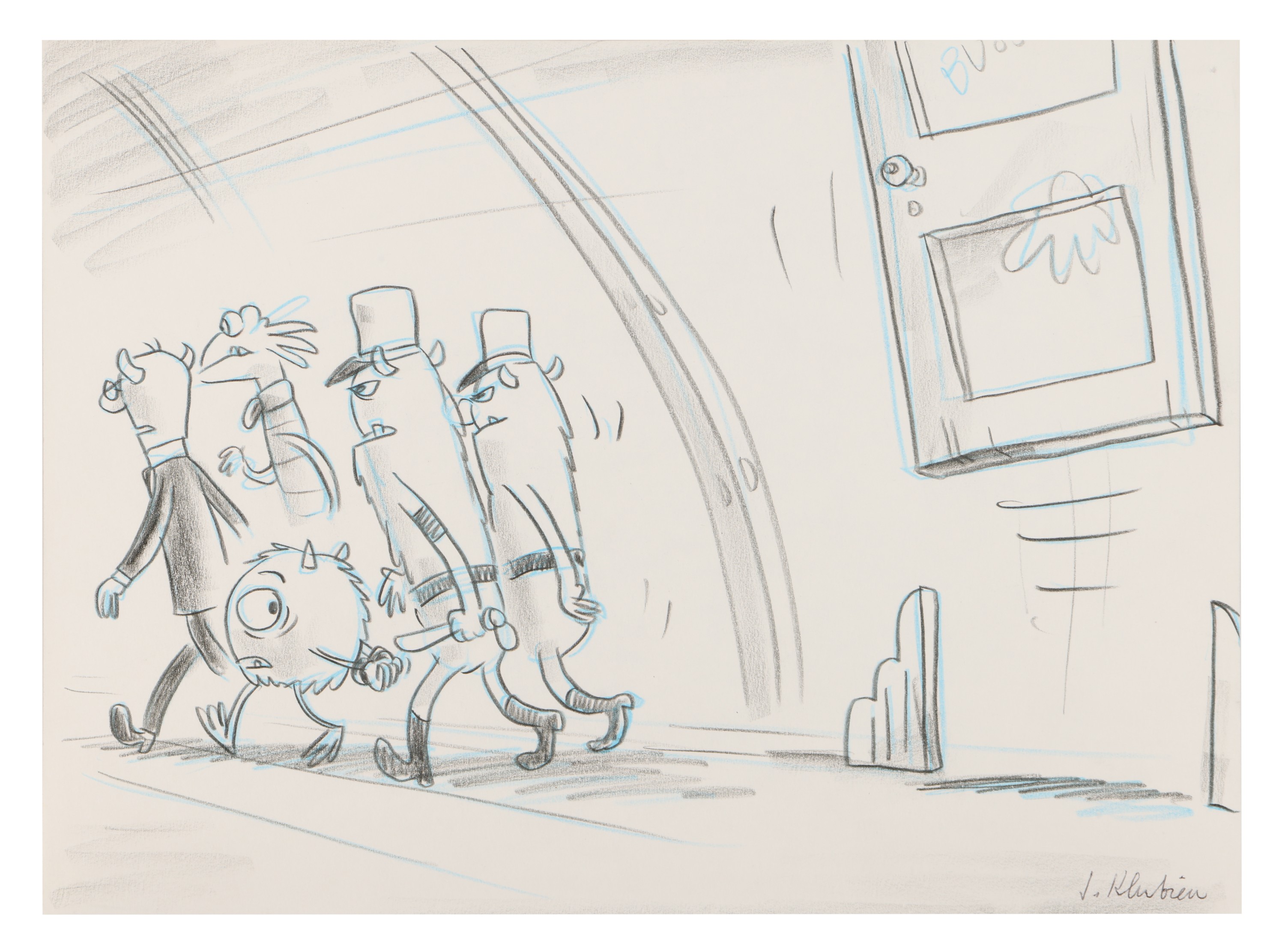 – MONSTERS, INC. (2001) Mike Wazowski, Randall and the CDA Guards Original Production Hand-Drawn Beat Board (Signed by Jorgen Klubien) est. $1,320 – $2,640 (£1,000 - £2,000)