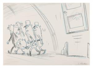 Once the tone and palette are set, animators move into early planning drawings that help establish the rhythm and emotional flow of a scene. The MONSTERS, INC. (2001) hand-drawn beat board signed by Jorgen Klubien (est. $1,320 – $2,640) illustrates how Pixar shaped the tone, timing, and narrative cadence before animation began. Beat boards like this guided how character action and storytelling would unfold.